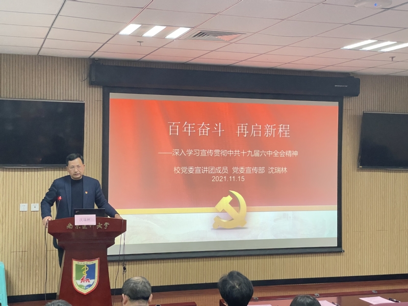 沈常委以《百年奋斗,再启新程——深入学习宣传贯彻中共十九届六中全会精神》为题,介绍了大会的召开背景,主要议程及重大意义,重点分析了《决议》的内容及重大创新,总结了新时代发展的重大成就,阐明了百年奋斗的历史意义。