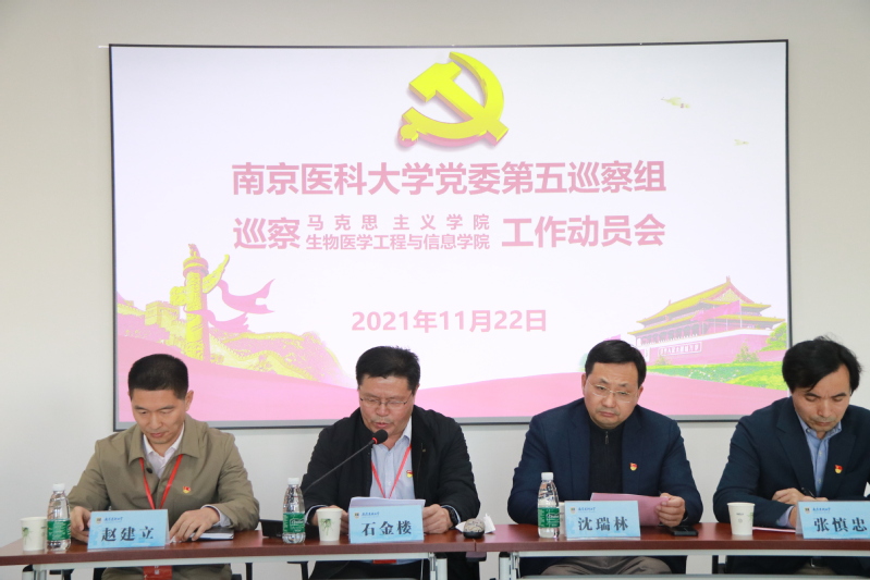 2021年11月22日下午,校党委巡察五组巡察马克思主义学院党总支、生物医学工程与信息学院党总支工作动员大会在江宁校区明达楼320会议室召开。校党委副书记、纪委书记、省监委派驻监察专员石金楼,校党委常委、宣传部统战部部长、马克思主义学院党总支书记沈瑞林,生物医学工程与信息学院党总支书记张慎忠,巡察五组全体成员和学院领导班子成员、师生代表参加了本次动员会。