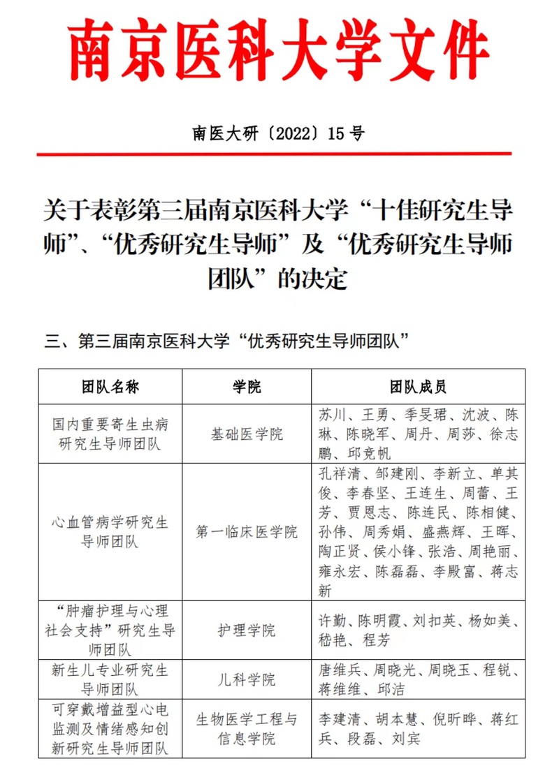 近日,第三届南京医科大学“优秀研究生导师团队”评审结果公布。我院“可穿戴增益型心电监测及情绪感知创新研究生导师团队”荣获南京医科大学“优秀研究生导师团队”称号。