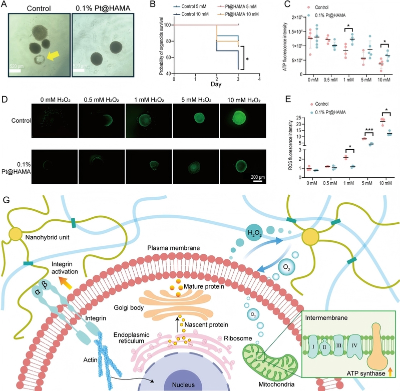 针对上述瓶颈,研究团队受此前朱美芳院士提出的介观尺度有机-无机杂化界面构建策略的启发,利用多种来源的天然生物大分子(如 HAMA、AlgMA、GelMA)构建了在微观尺度具有稳定界面的杂化单元。该研究通过引入经典聚合物“链滴模型(blob model)”揭示了杂化单元的微观结构,成功实现了生物安全性、物理力学匹配、生物催化功能与生理环境兼容性的系统集成。基于此构建的多功能纳米杂化水凝胶不仅将哺乳动物细胞生产高质量PD-L1蛋白的效率提升了近一个数量级,还在皮肤类器官抗氧化保护及生物3D打印等前沿领域展现了广阔的应用前景。