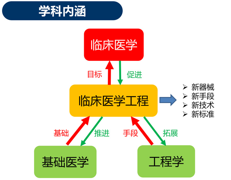 2016年,南京医科大学设置临床医学工程交叉学科,其内涵同时覆盖了“临床工程”与“医学工程”两个范畴,主要以基础医学中的病理学、药理学、医学统计学等为基础,以工程学中的相关技术为手段,实现临床诊疗技术水平的提升,从而推动生物电子学、康复工程学、生物医学测量学、生物医学材料学及生物统计学、医学信息学等子学科的发展,且更侧重于临床应用。